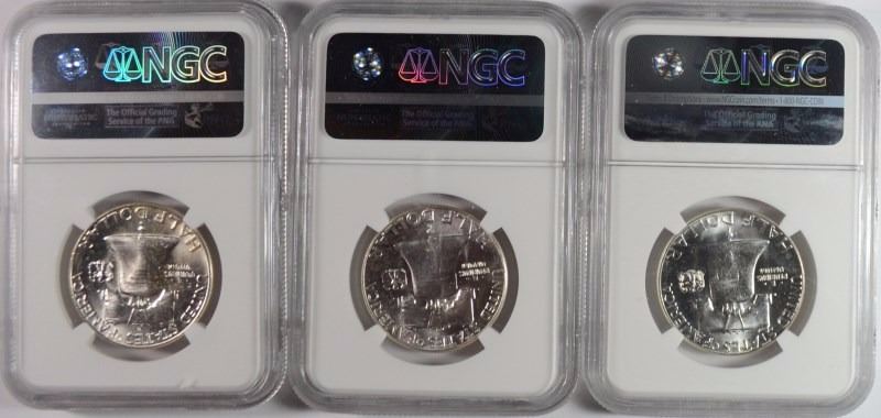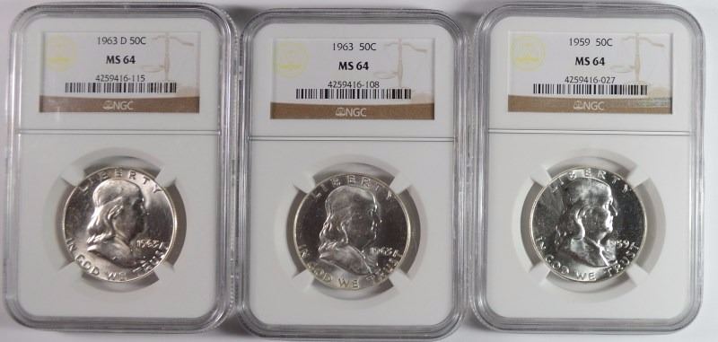 1959, 63 & 63-D FRANKLIN HALF DOLLARS, NGC MS-64