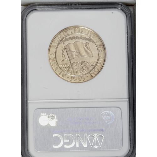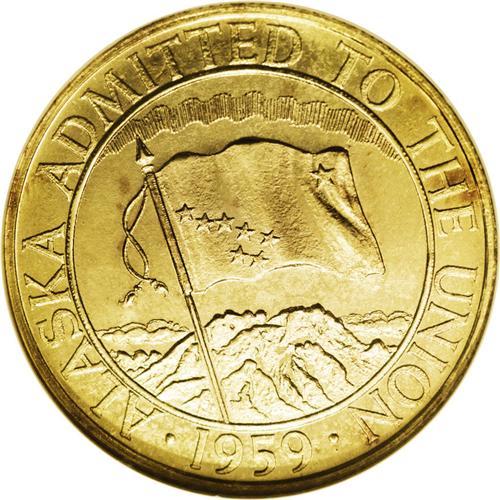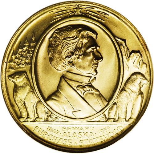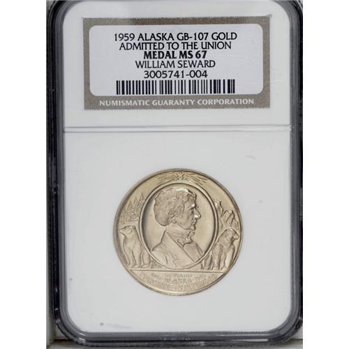 <B>1959 Alaska Statehood Medal in Gold MS67 NGC.</B></I> GB-107. William Seward is depicted on the obverse, flanked by two bears, pine trees, and a mountain. The center of the reverse depicts an Alaskan flag with the Northern Lights above. ALASKA ADMITTED TO THE UNION 1959 surrounds the scene. A rare gold medal missing from many collections.
