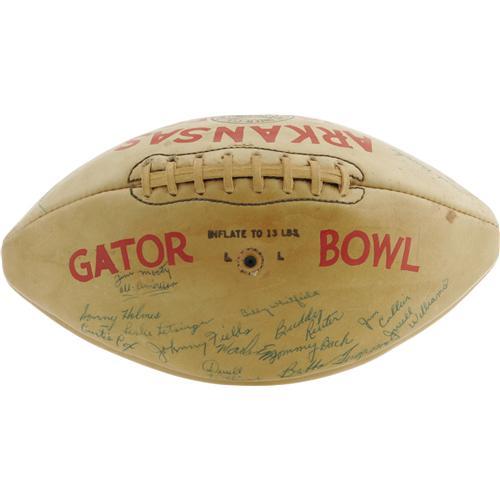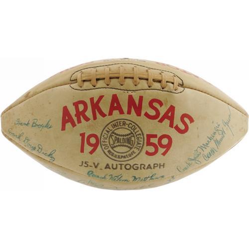 <B>1959 University of Arkansas Razorbacks Team Signed Football.</B></I> Considered one of the finest teams ever to take the field in Fayetteville, the 1959 team rolled to a fourteen to seven Gator Bowl win over the Georgia Tech Yellow Jackets, earning a share of the Southwest Conference title. That team, and that historic win that snapped Georgia Tech's six-bowl game winning streak, are commemorated here with a football signed by forty-five members of the team, most notably famed coach Frank Broyles, All-American Jim Mooty, Lance Alworth and Barry Switzer. All autographs remain as dark and bold as the day they were signed, though a couple panels apparently once got a bit wet, causing some of the ink to bleed slightly. As the photographs will show, this factor does little to detract from the visual appeal. "Arkansas 1959" and "Gator Bowl" are expertly painted on either side of the ball's lacing. The odds of ever finding another opportunity to own this special college ball are slim indeed. <I>LOA from PSA/DNA.</B></I> <BR><BR><B>Important notice:</B> Heritage usually auctions material at the rate of 200-250 lots per hour. On some occasions eBay Live bid software or the Internet may not be able to keep up with the pace of the auction. We recommend placing a realistic absentee bid now as insurance to avoid disappointment. Occasionally the auctioneer may eliminate or reject an eBay Live bid, and the auctioneer may also reopen a lot after the close of the eBay live bidding (usually because we missed an audience bid), and may reject your bid even if it shows you as the winning bidder. By bidding via eBay Live, you agree that Heritage may award the lot to another bidder at its sole discretion under the circumstances described above or any other reasonable circumstances. Since eBay bids are not shown to us until we open the lot on the floor, we treat those bids just like floor bids. In most cases the floor responds before the eBay bid is presented to us, due to Internet lag time, so for consistency we have made it a policy that floor bids are always considered first over tie eBay live bids. Also please note that all Heritage lots purchased through eBay Live carry a 22.5% Buyer's Premium. Please make sure you read the Terms and Conditions before you bid. This lot is being auctioned in conjunction with a live floor auction by Heritage Galleries & Auctioneers. All final auction and invoice information will be supplied by Heritage Galleries & Auctioneers, and all other information should be considered preliminary. Lot:19295 <BR><BR><B>Winning Notification and Billing:</B> After the FINAL session in this auction is complete, Heritage will send e-mail and snail mail invoices. This process normally takes several days. All final auction and invoice information will be supplied by Heritage Galleries & Auctioneers, and all other information should be considered preliminary. <BR><BR>This auction will be conducted on a live auction floor and over the Internet through eBay Live. If you choose to place an absentee bid, please take a moment to <font color='#0000ff'><u><a href='http://pages.ebay.com/liveauctions/help/before/laabsentee.html'>learn how eBay Live absentee bidding works</a></u></font><font color='#000000'>