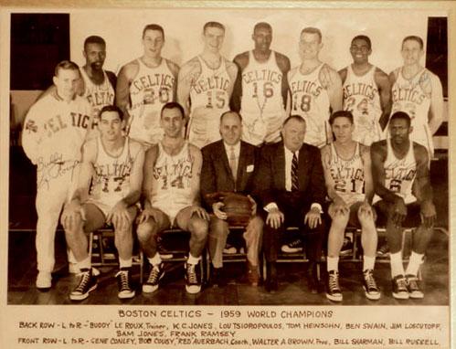 1959 signed photo of the world champion Boston Celtics. Signatures in ball point pen present upon each players' respective image. Signed as team members, included from back row, left to right: ''Buddy'' Le Roux (Trainer), K.C. Jones, Lou Tsioropoulos, Tom Heinsohn, Ben Swain, Jim Loscutoff, Sam Jones, Frank Ramsey. From front row, left to right: Gene Conley, Bob Cousy, Arnold ''Red'' Auerbach (Coach), Bill Sharman and Bill Russell. President Walter A. Brown is pictured without autographing. Title under photo in clear blue ink reads ''Boston Celtics - 1959 World Champions'', followed by list of names in order of appearance. Black and white photograph measures 14'' x 11'', overall frame measures 20.5'' x 17.25''. Slight but even toning throughout photo, otherwise fine condition. With PSA/DNA COA.