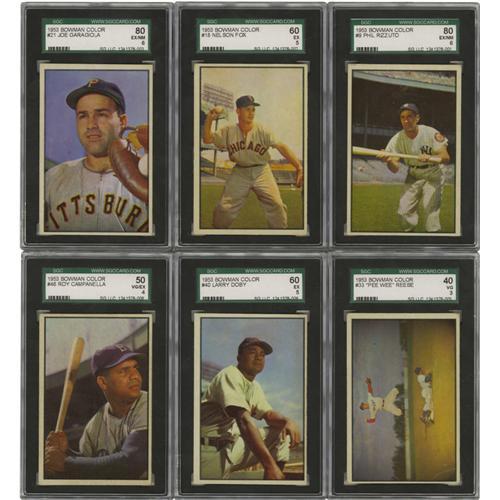 <B>1953 Bowman Color Baseball Complete Set (160).</B></I> The first set of contemporary Major League players to feature color photography, this set marks a major milestone in the history of collectible cardboard and remains one of the most popular issues of the post-war era. A total of eighteen cards have been graded by SGC with an aggregate SMR value of $2881. Graded cards - <B>SGC 84 NM 7: Q #80 Kiner, 81 Slaughter; <B>SGC 80 EX-NM 6:</B></I> #9 Rizzuto, 21 Garagiola; <B>SGC 70 EX+ 5.5:</B></I> #92 Hodges; <B>SGC 60 EX 5:</B></I> #18 Fox, 40 Doby, 114 Feller; <B>SGC 50 VG-EX 4:</B></I> #32 Musial, 44 Bauer/Berra/Mantle, 46 Campanella, 59 Mantle, 97 Mathews, 121 Berra, 153 Ford; <B>SGC 40 VG 3:</B></I> #33 Reese, 117 Snider, 118 Martin. Ungraded cards include #1 Williams (EX/MT), 36 Minoso (EX), 55 Durocher (EX), 62 Kluszewski (VG/EX), 65 Roberts (VG/EX), 84 Bauer (VG/EX), 99 Spahn (GD, red ink on right border of card), 146 Wynn (EX). Grades 71% EX to EX/MT, 29% VG to VG/EX.<BR><BR><b>Shipping:</b> Sportscard (<a target="_blank" href="http://www.heritageauctions.com/common/shipping.php">view shipping information</a>)