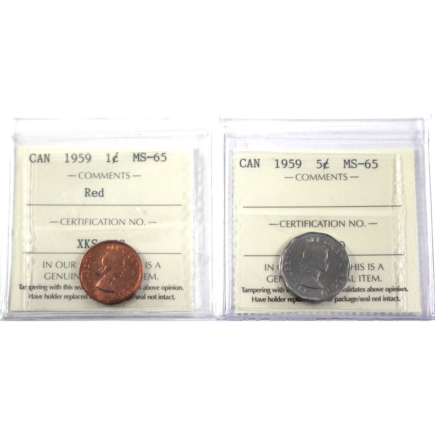 1959 Canada 1-cent & 5-cent ICCS Certified MS-65. 2pcs