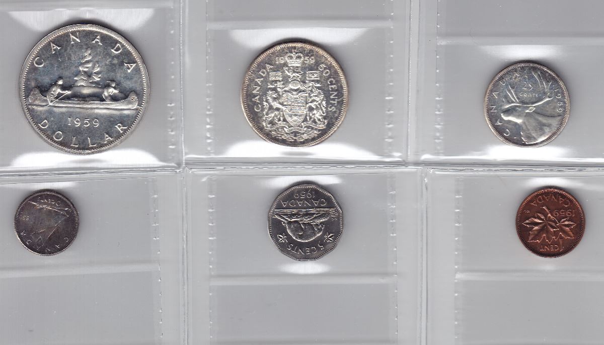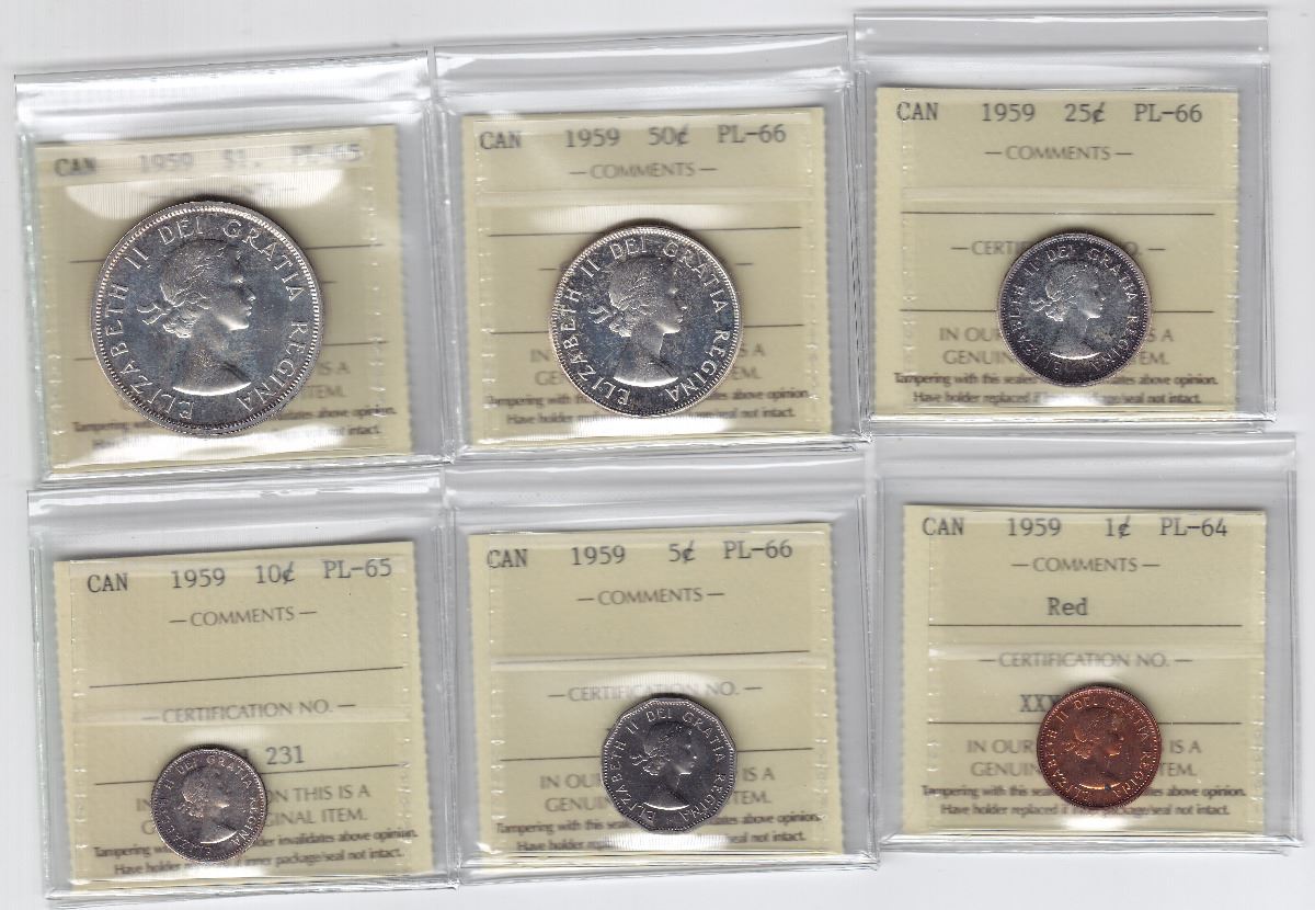 1959 Canadian Coin Set - Graded By ICCS - Silver $1 (PL65), Silver 50-Cent (PL66), Silver 25-Cent (PL66), Silver 10-Cent (PL65), 5-Cent (PL66), 1-Cent (PL64 - Red) -- Trends Value $150
