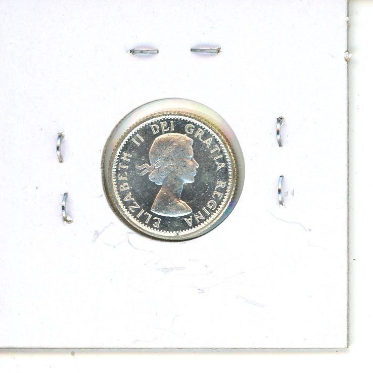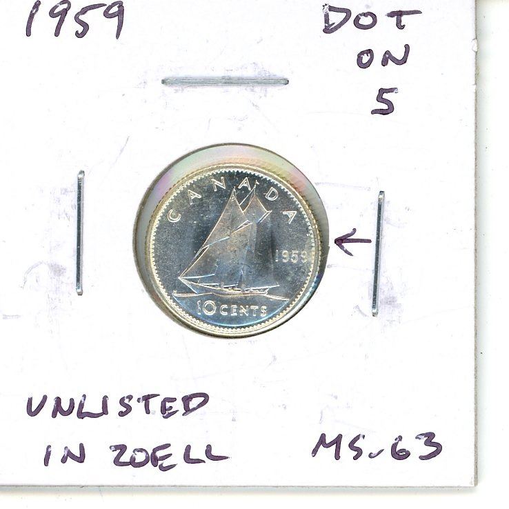 1959 Canadian Silver 10 Cents. This variety has a Dot on the bottom of the 5. Not listed in Zoell. MS-63. Bright White.