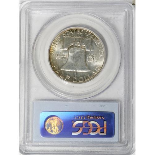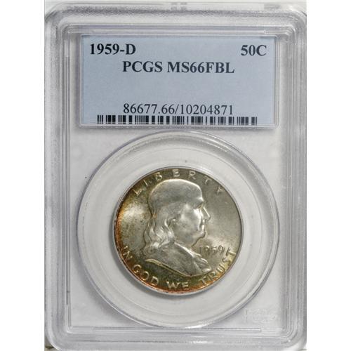<B>1959-D 50C MS66 Full Bell Lines PCGS.</B></I> Cherry-red and lemon-gold bands grace the left borders, while the remainder of this lovely Premium Gem is pearl-gray. A scarce issue with such exemplary preservation. Population: 46 in 66, 2 finer (1/07).<BR><I>From The Southern Collection.</B></I><BR><BR><b>Shipping:</b> Coins & Currency (<a target="_blank" href="http://www.heritageauctions.com/common/shipping.php">view shipping information</a>)