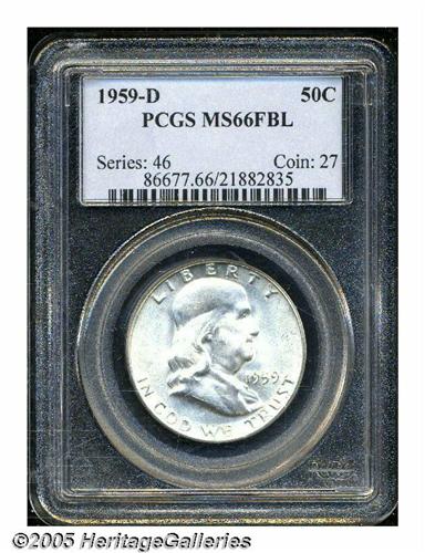 <B>1959-D<50C> MS66 Full Bell Lines PCGS.</B></I> Lustrous blue-golden surfaces, very well preserved with only the most trivial of imperfections. As of (6/05), only two have been graded higher by either major service.<BR><I>From The Southern Collection.</B></I>