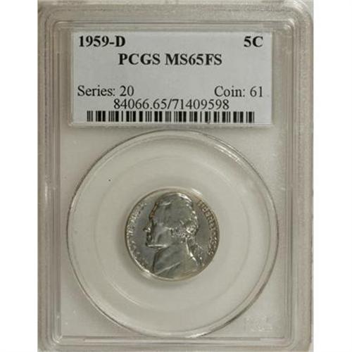 <B>1959-D 5C MS65 Full Steps PCGS.</B></I> PCGS Population (48/6). NGC Census: (3/3). (#84066)<BR><BR><b>Shipping:</b> Coins & Currency (<a target="_blank" href="http://www.heritageauctions.com/common/shipping.php">view shipping information</a>)