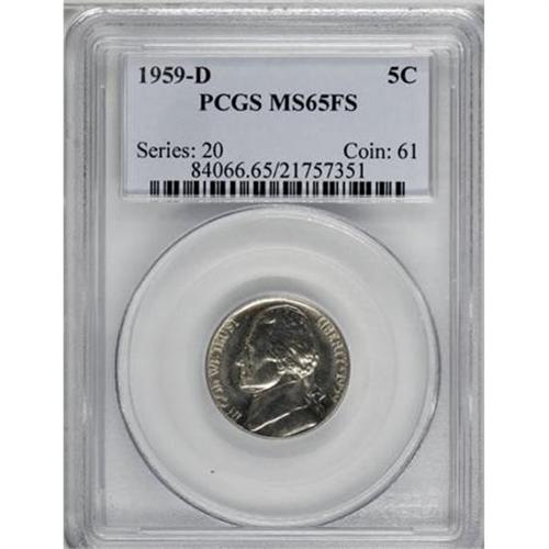 <B>1959-D 5C MS65 Full Steps PCGS.</B></I> PCGS Population (48/6). NGC Census: (3/3). (#84066)<BR><BR><b>Shipping:</b> Coins & Currency (<a target="_blank" href="http://www.heritageauctions.com/common/shipping.php">view shipping information</a>)