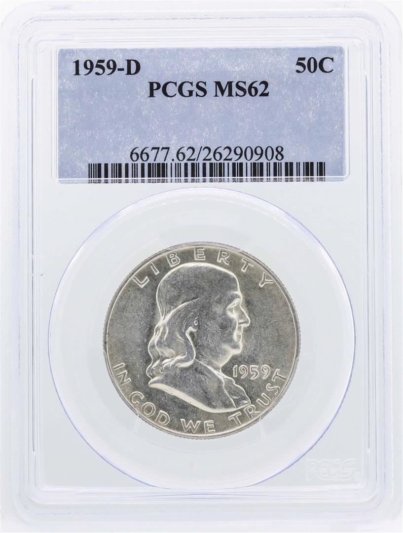 One 1959-D Franklin Half Dollar Coin PCGS MS62. PCGS Graded.
