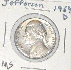 1959-D JEFFERSON NICKEL *RARE MS HIGH GRADE-NICE EARLY COIN!! NICKEL CAME OUT OF SAFE!! ***Coin, Currency & All Items Listed in this auction - Grades, Conditions and Values are not Safe Deposit Coins LLC Responsibilty. Grades, Condition and Values are determined by Consigner(s) & Buyers ONLY