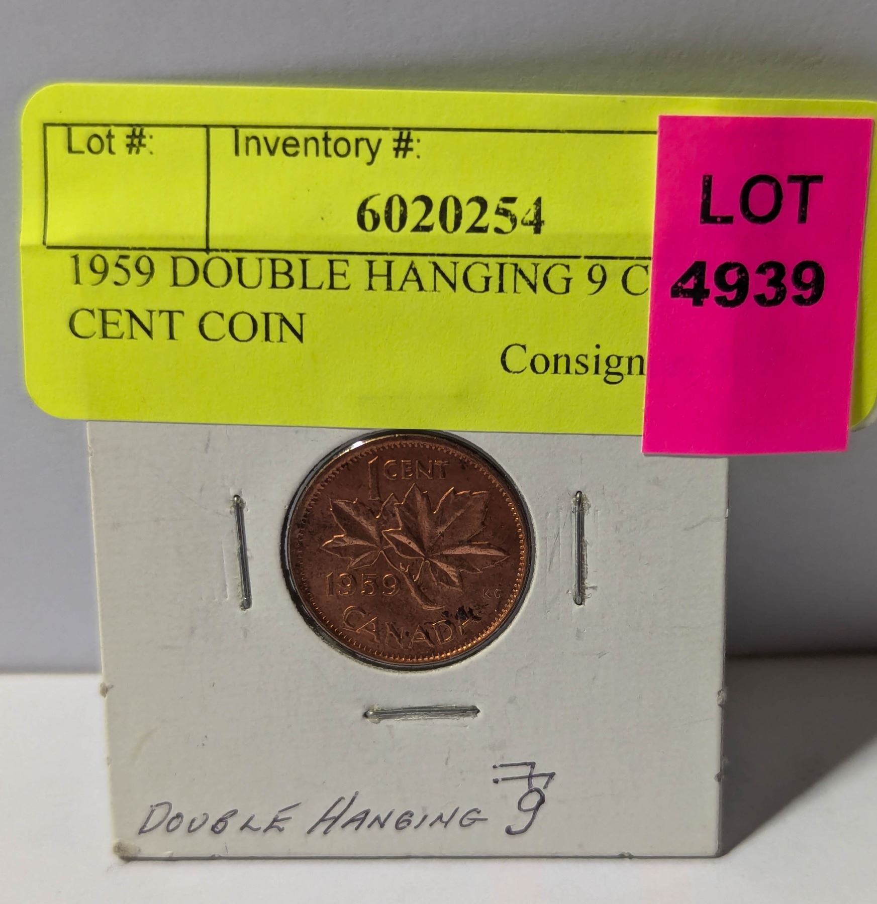 1959 DOUBLE HANGING 9 CANADA 1 CENT COIN