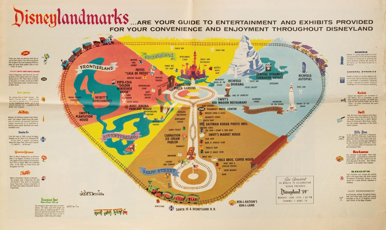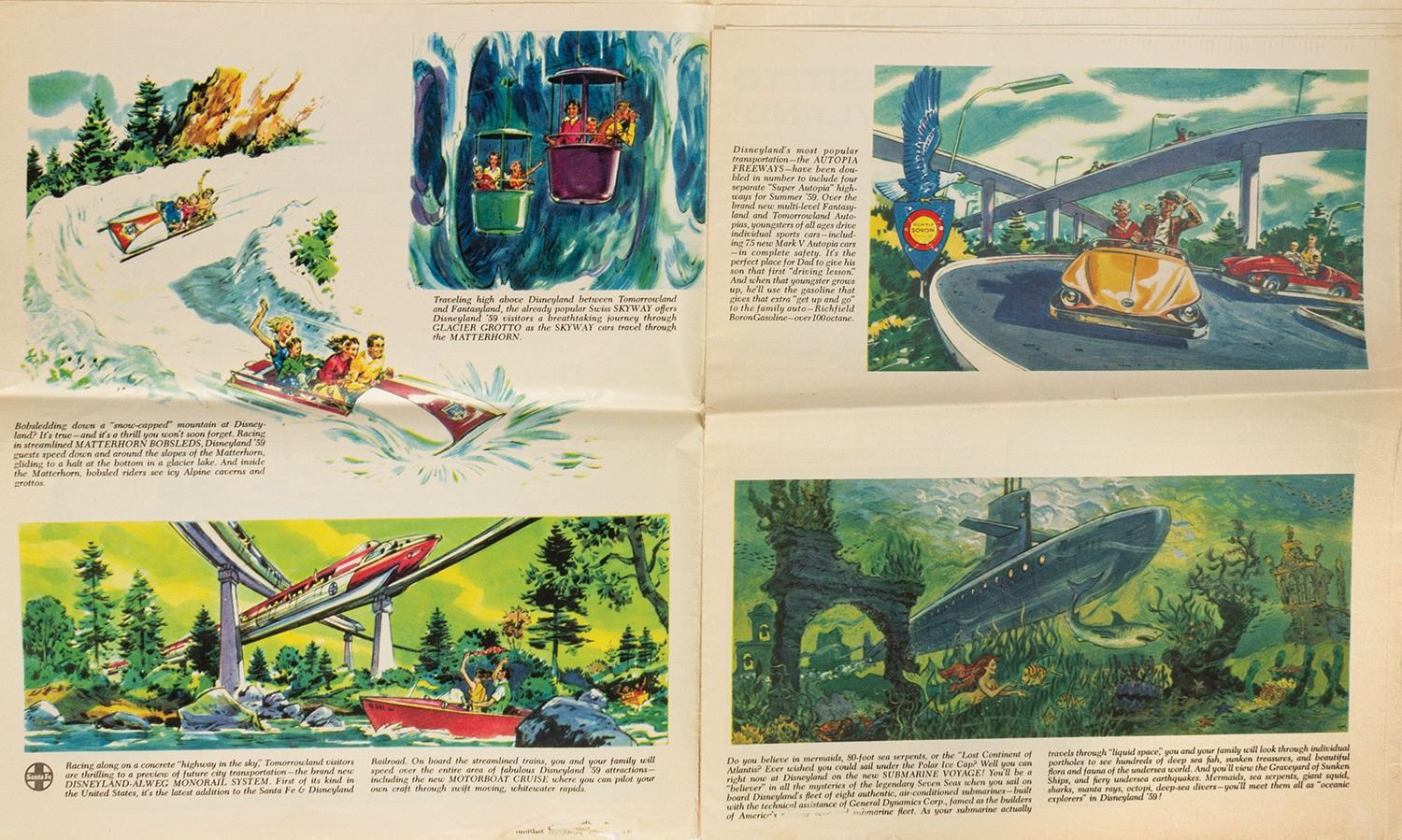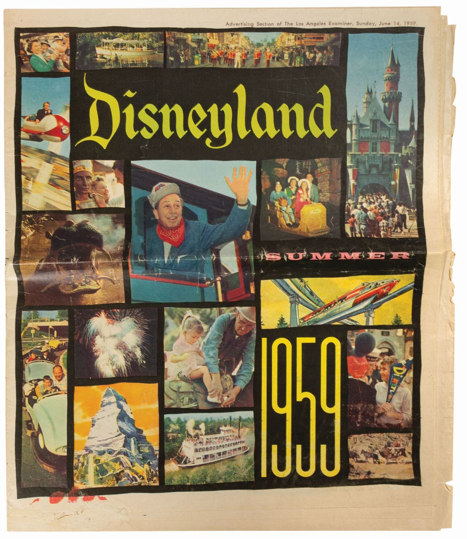 (Disneyland, 1959) A beautiful 24-page newspaper insert advertising the grand re-opening of Disneyland in 1959. This was the largest expansion to date for the park and was a major event that included a live TV re-opening broadcast. The insert is filled with full-color photos of the park as well as concept paintings of the new attractions. Measuring 11x13", the newspaper insert is in fair condition with some edge-wear and a horizontal crease from being folded.