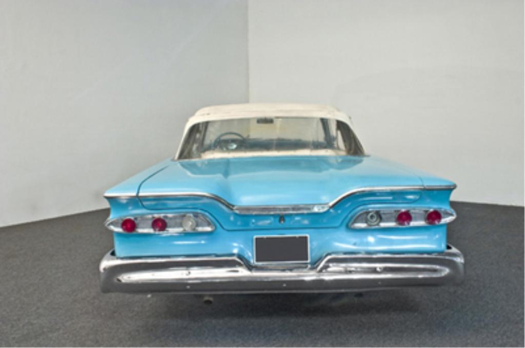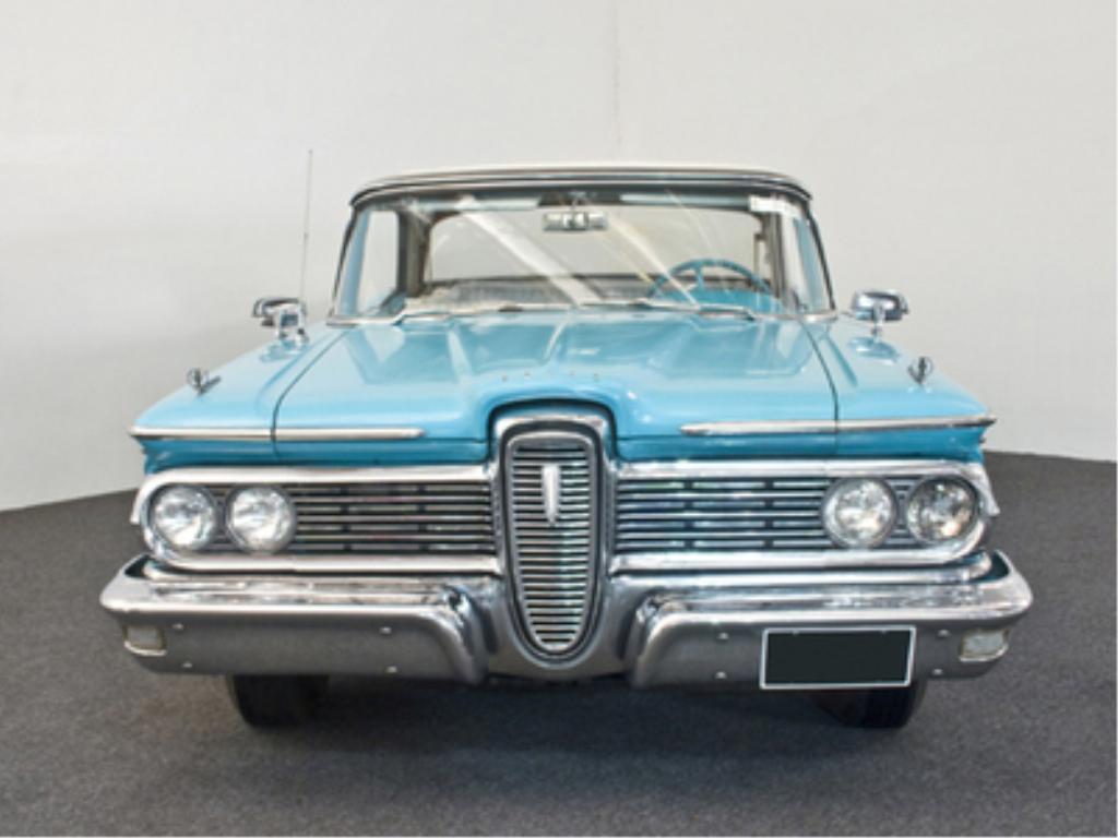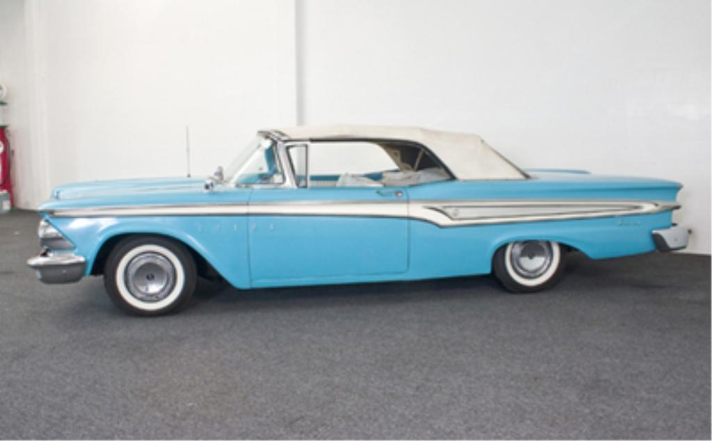 1959 Edsel Corsair Convertible 332 cid overhead valve V8 engine rated at 225 horsepower, two-barrel carburetor, two-speed automatic transmission, coil spring front suspension, solid rear axle with leaf springs, four-wheel self-adjusting drum brakes; wheelbase: 120"-This Edsel has been with the same family for the last twenty years and was used only at their summer home for weekend use. It features a strong and powerful 332 V8, Mile-O-Matic automatic transmission, power steering, power top, and wide white wall tires. The body retains the original solid sheet metal, and the paint presents quite well although it was applied many years ago. At some point the interior was re-upholstered in a nice clean white vinyl with matching top boot. All trim and chrome is complete and in excellent original un-restored condition. For a 50 year old car, it shows remarkably well. This Corsair drives excellently. The motor is smooth, transmission shifts good, and will take you wherever you want to go. While not an over-restored car, it can be used on a regular basis. It has been well maintained and is ready to be driven and enjoyed