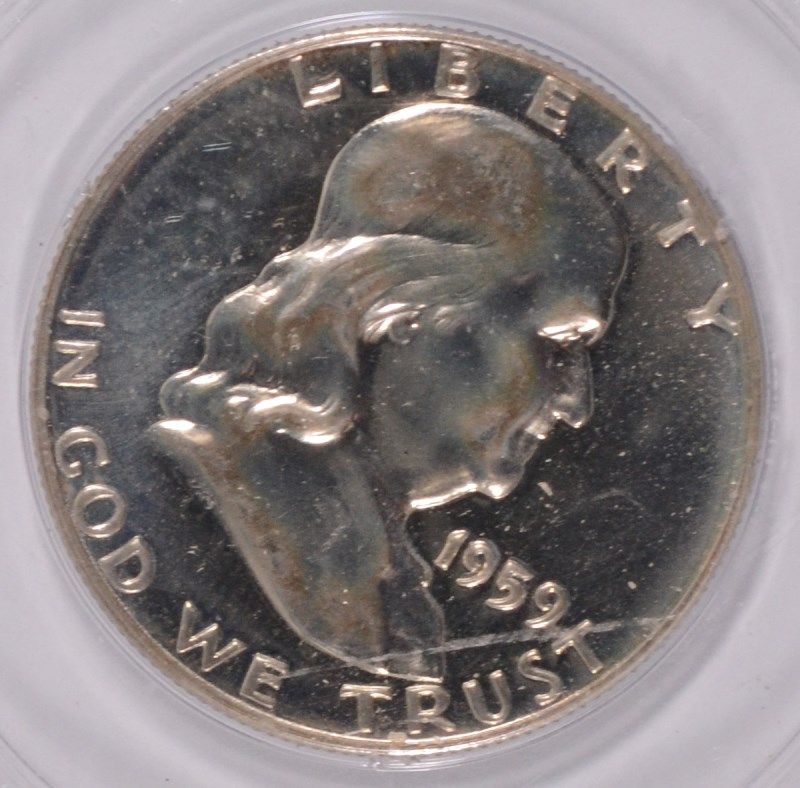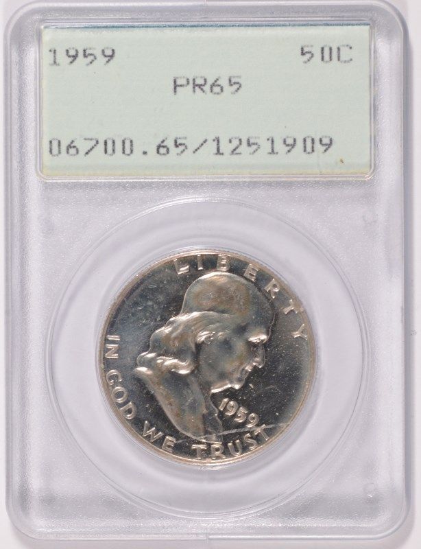 1959 FRANKLIN HALF DOLLAR, PCGS PROOF-65 "RATTLER HOLDER"