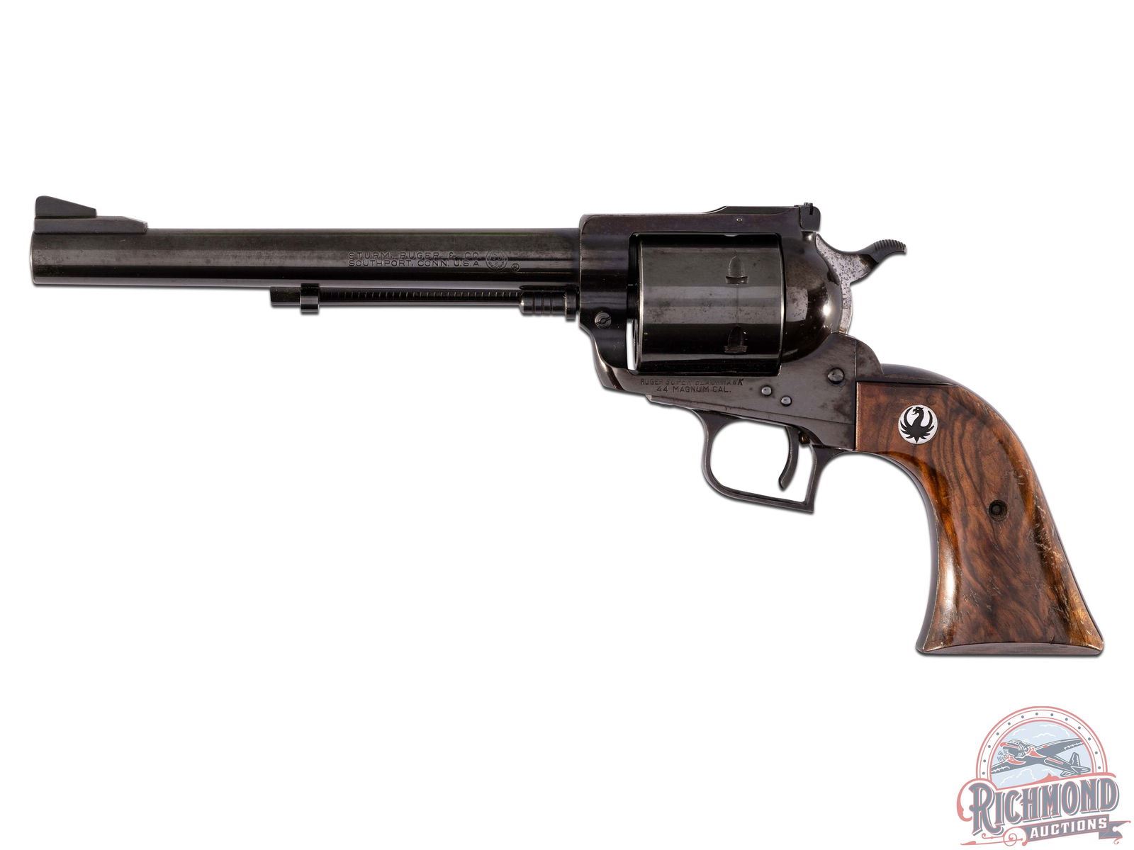 Manufactured in 1959, this is a first year production Super Blackhawk, serial number 324. Features a 7-1/2" blued barrel on the larger "Super" frame, with ramp blade front sight and rear adjustable notch sight. Left side of the barrel is stamped "STURM, RUGER & CO / SOUTHPORT, CONN. U.S.A." with the Ruger Phoenix logo. Blued receiver and 6 round non-fluted cylinder. Left side of the frame is stamped "RUGER SUPER BLACKHAWK / 44 MAGNUM CAL". Factory stamped "C" under the grips. Factory high grade walnut smooth grips with silver tone Ruger medallions. CALIBER: 44 MAG. S/N: 324. FFL STATUS: Curio & Relic.