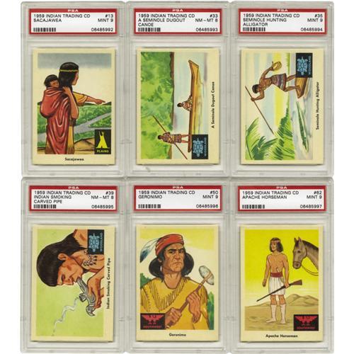<B>1959 Fleer "Indian Trading Cards" High-Grade Set (80).</B></I> Indian chiefs and the Native American lifestyle are depicted in this early Fleer non-sport card set. Six cards have been graded by PSA including - <B>PSA 9:</B></I> #13 (1 of 3 population), 35, 50 (1 of 7 population), 62 (1 of 4 population); <B>PSA 8:</B></I> #33, 39. Set grades 82% NM to NM/MT, 18% EX to EX/MT (one lesser).