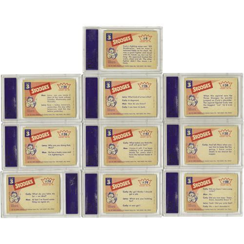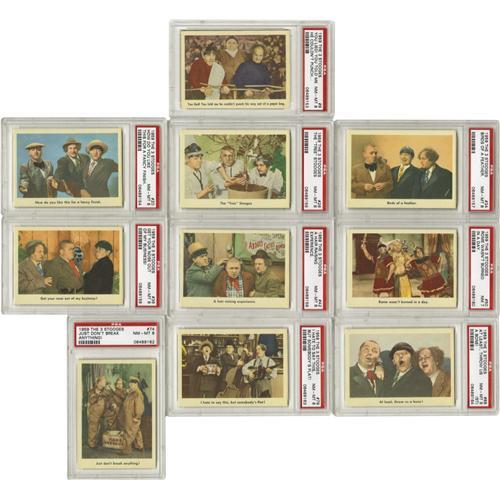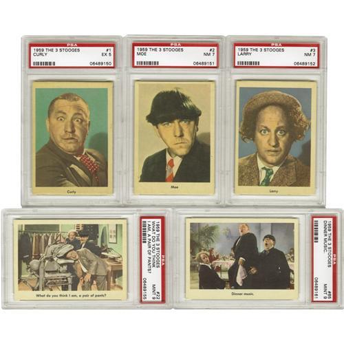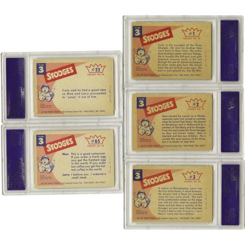 <B>1959 Fleer "The 3 Stooges" Complete High-Grade Set (96).</B></I> N'yuk, N'yuk! Woo, Woo, Woo! Unh, Unh, Unh! Soitenly the most successful comedy of all-time; Moe, Larry and either Curly, Shemp or Joe made a total of 195 Columbia Shorts between 1934 and 1958. The comedic giants made their cardboard debut a year later, when the Frank H. Fleer Corp. under license from Norman Maurer Productions, Inc. produced a 96-card full-color set. A total of fifteen cards have been graded by PSA with an aggregate SMR value of $852. Highlights include - <B>PSA 9:</B></I> #22 (1 of 2 population), 65 (none graded higher); <B>PSA 8:</B></I> #9, 20, 26, 34. 36, 42, 74, 79, 88 (ST); <B>PSA 7:</B></I> #2 Moe, 3 Larry, 50; <B>PSA 5:</B></I> #1 Curly. Set grades 68% NM to NM/MT, 32% EX to EX/MT (some lesser).