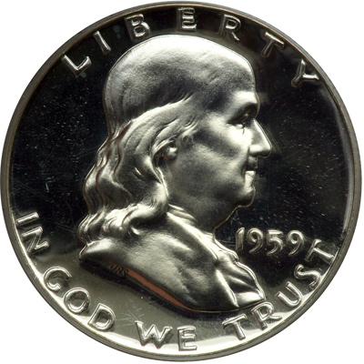 1959 Franklin Half Dollar. PCGS graded Proof 68 Cameo. A magnificent superb totally white gem. Pop 29; none finer (PCGS # 86700) .