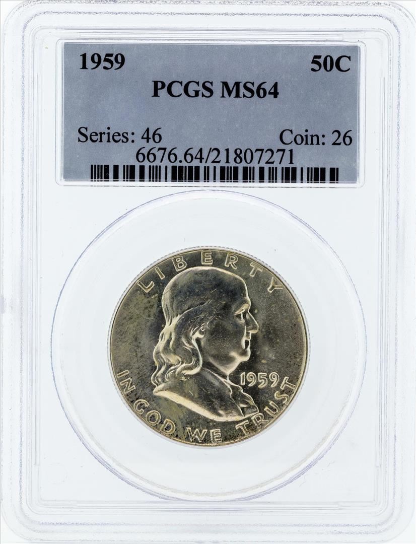 One 1959 Franklin Silver Half Dollar Coin NGC MS64. PCGS Graded.
