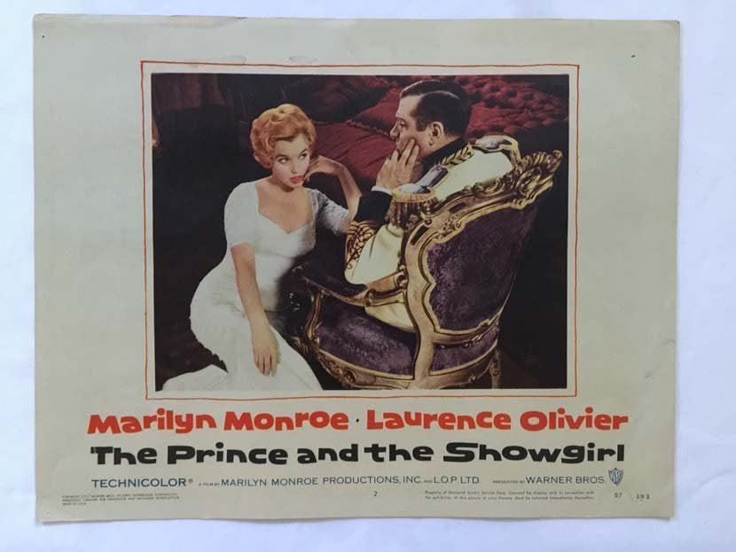 An original Marilyn Monroe and Laurence Olivier, PRINCE and the SHOWGIRL movie lobby card. A traveling party of royals from central Europe arrives in England in 1911, as the host country prepares to celebrate the coronation of a new king. But when the visiting Regent (Laurence Olivier) goes to a musical theater, his attraction to American performer Elsie (Marilyn Monroe) makes it hard to stay focused. Soon, Elsie learns of a potential coup in the Regent's home country, and it's up to her to smooth things out -- or watch as the nation hurtles toward instability. Initial release: June 13,1957. Director: Laurence Olivier.It is labeled 57/393 #2.