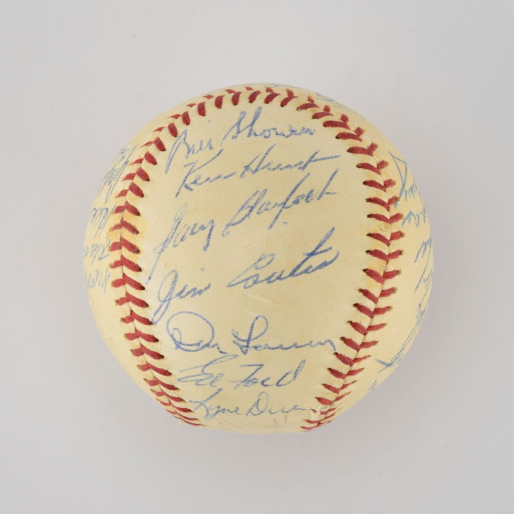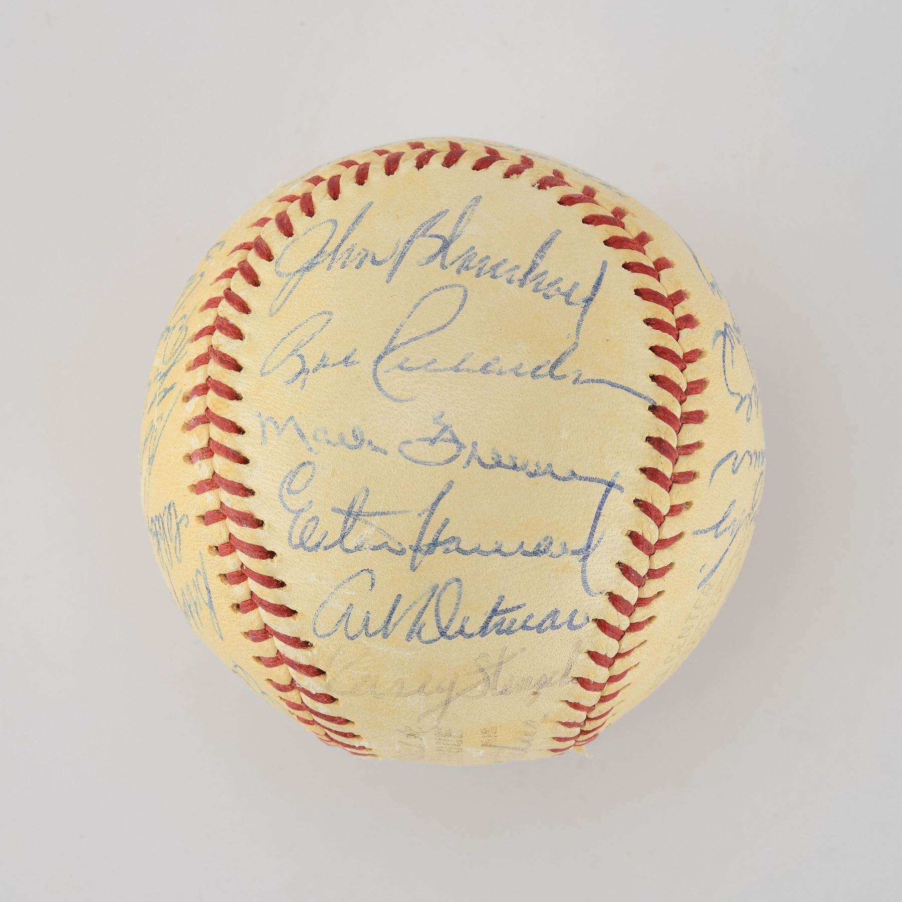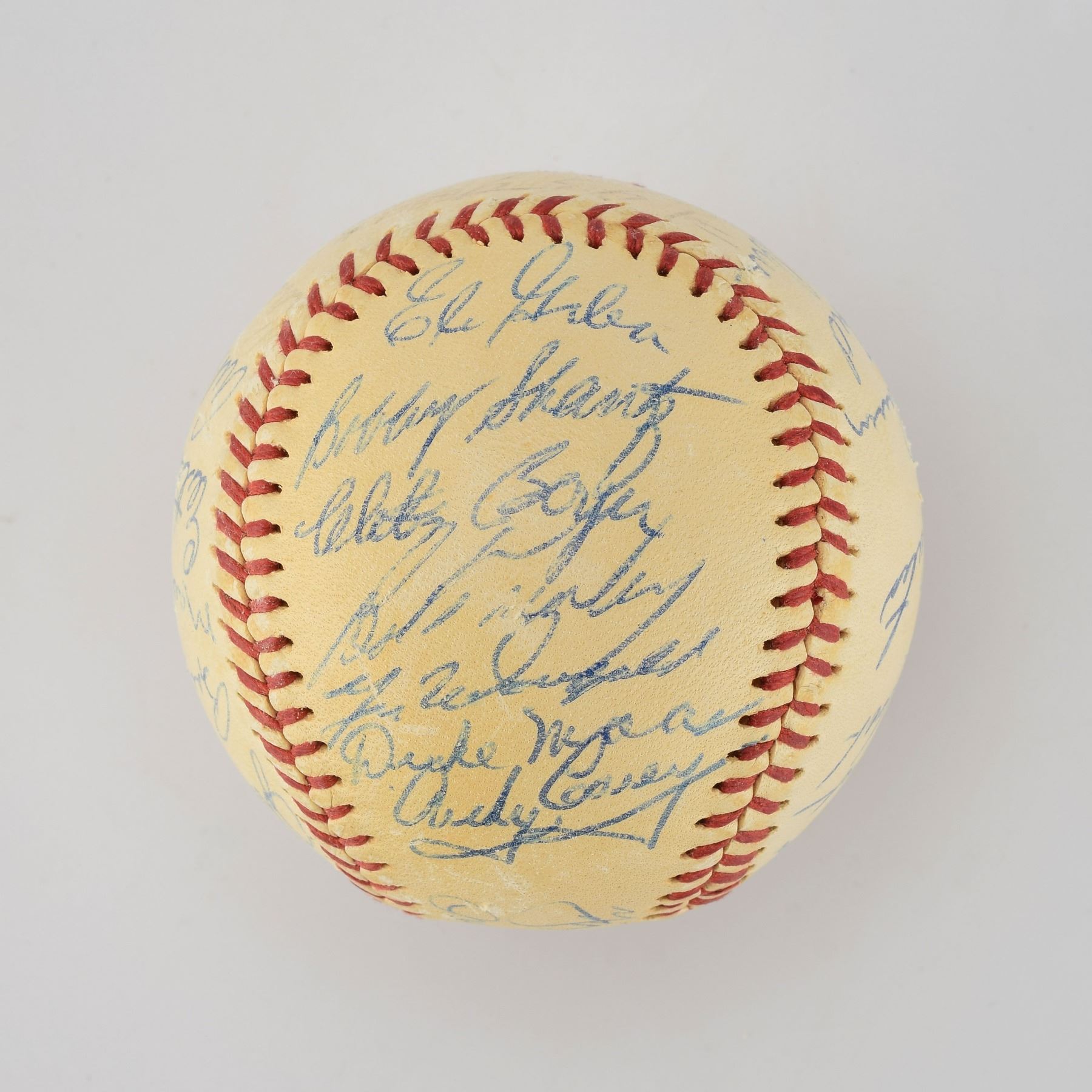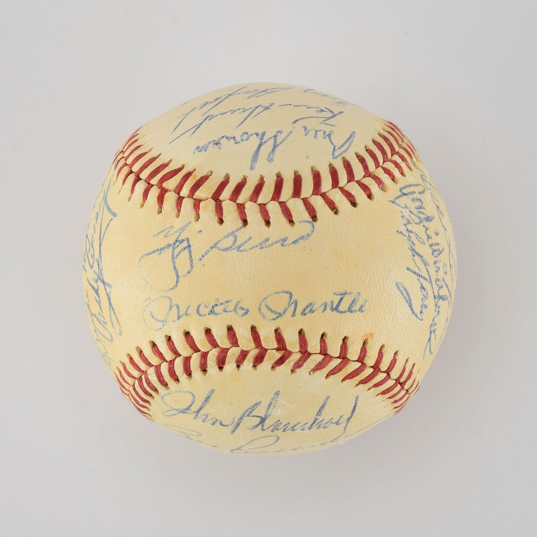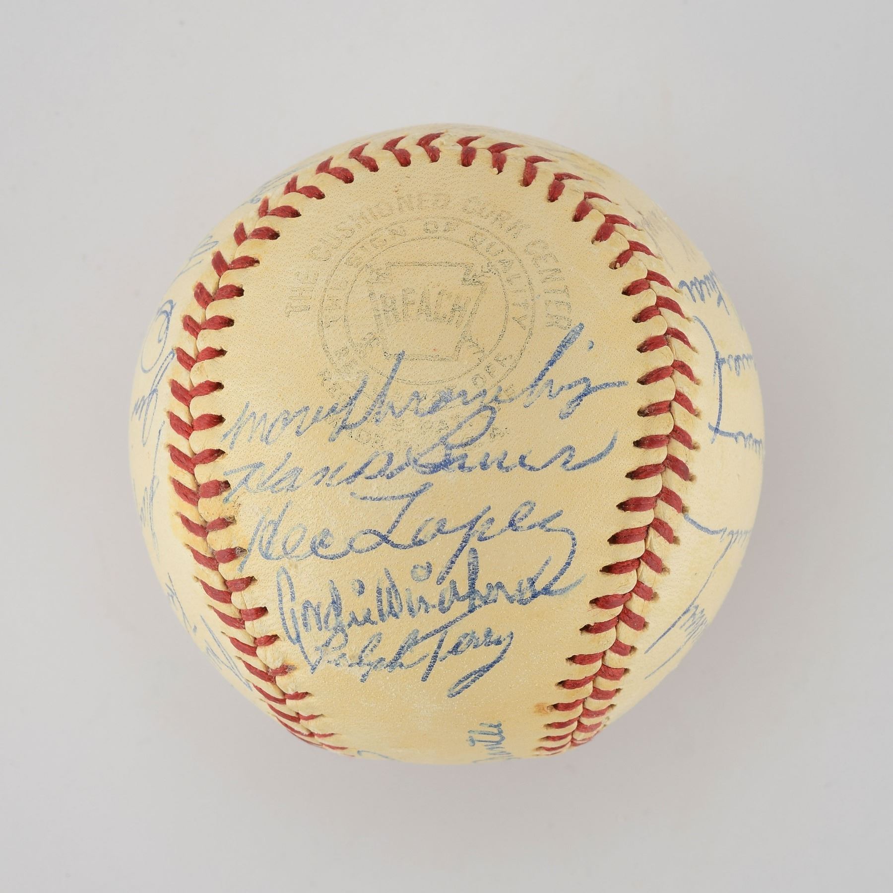 After winning a World Series title the year before, the Yankees allowed another team to win the American League in 1959. This off-white/lightly creamy OAL Reach baseball contains 27 blue ink signatures, with pronounced original stampings.