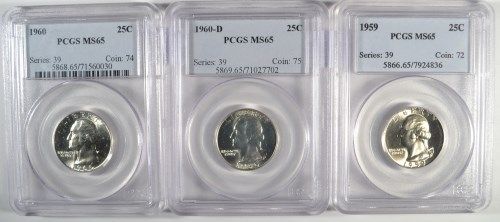 1959 PCGS MS65, 1960 PCGS MS65 & 1960-D PCGS MS65 WASHINGTON QUARTERS