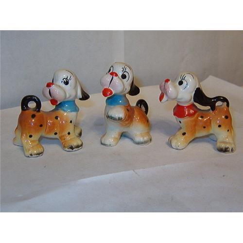 THIS IS A SET OF THREE DALMATIAN PUPPY DOG FIGURINES MADE IN JAPAN AROUND 1959. ALL THE DOGS THAT I PUT ON HERE ARE FROM MY OWN DOG COLLECTION. THIS DOG WAS ADDED TO MY COLLECTION ON APRIL 19, 1959. I HAVE OVER 300 DOGS THAT I RECEIVED FOR MY COLLECTION FROM 1954 TO 1964 THAT WILL BE PUT UP FOR SALE OR AUCTION. I HAVE THE EXACT DATE THAT I RECEIVED EACH DOG. SOME OF THE DOGS ARE OLDER THAN THE DATE THAT I RECEIVED THEM. I NOW HAVE OVER 1200 DOGS ( OLD AND NEW ) IN MY COLLECTION AND THEY ARE ALL UP FOR SALE OR AUCTION. I GUARANTY THAT MY DOGS ARE THE REAL (DOG) DEAL. MY DOGS ARE THE ORIGINAL OLD DOGS AND NOT THE FAKES AND REPLICAS. This Dog is in Excellent condition for its age. There are no chips, cracks or repairs on this Dog. I DO see age crazing on these Dogs. You can see most of this in my pictures. I HAVE OVER 800 POSITIVE FEEDBACKS FOR MY EBAY STORE. Thanks for Looking !!!