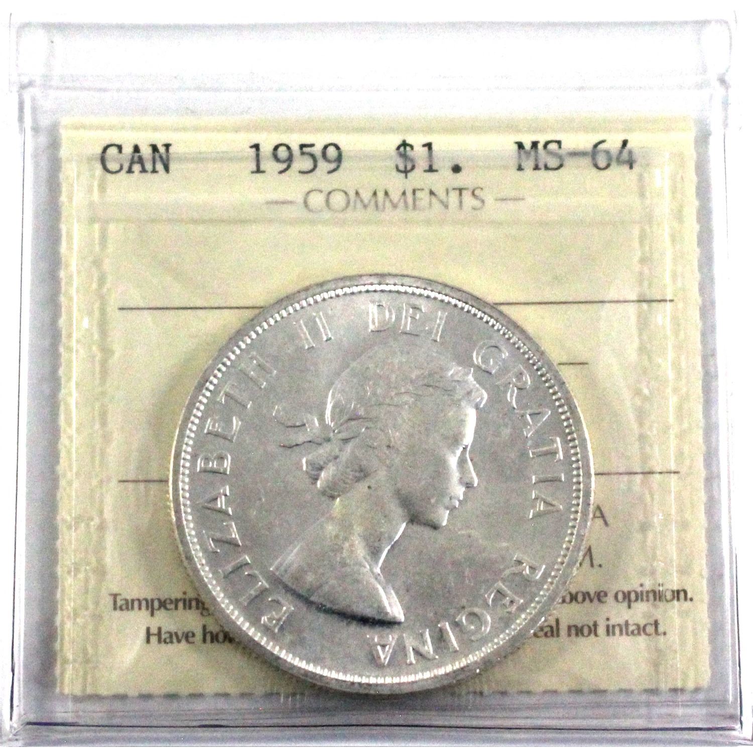 1959 Silver $1.00 ICCS Certified MS-64. A Bright coin with light toning throughout.
