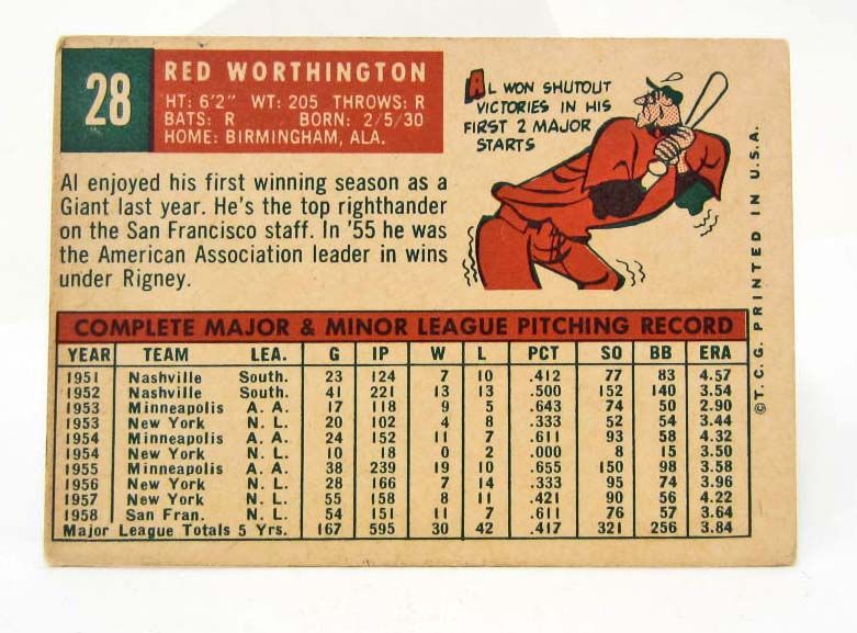 1959 TOPPS #28 RED WORTHINGTON GIANTS BASEBALL CARD
