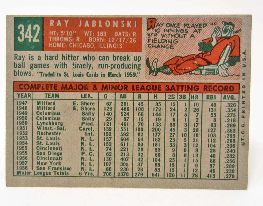 1959 TOPPS #342 RAY JABLONSKI GIANTS BASEBALL CARD
