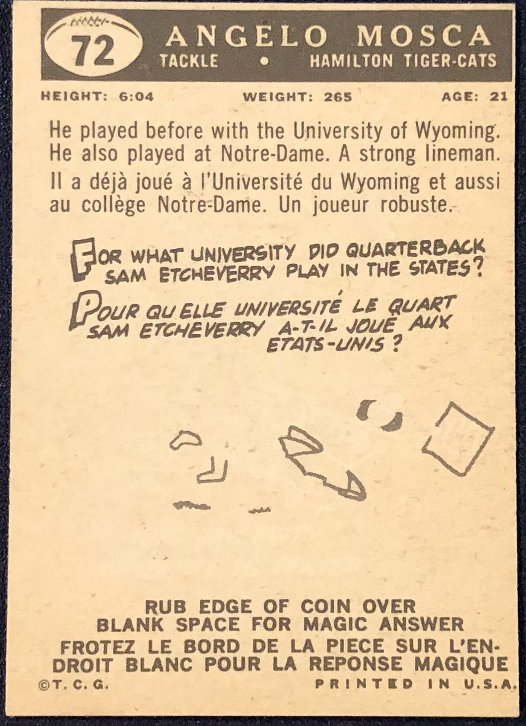 Card #72 CFL, football, hall of fame, rookie