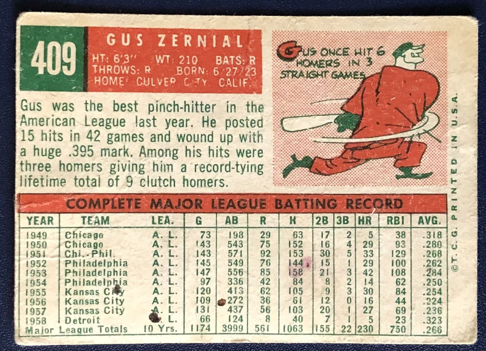 Card #409, Poor, filler quality vintage, MLB, baseball