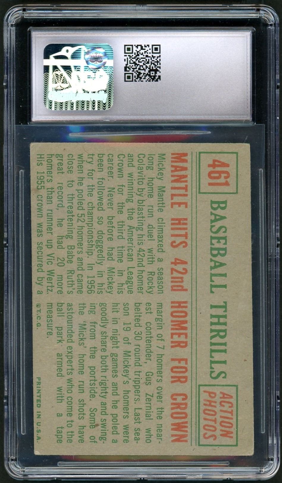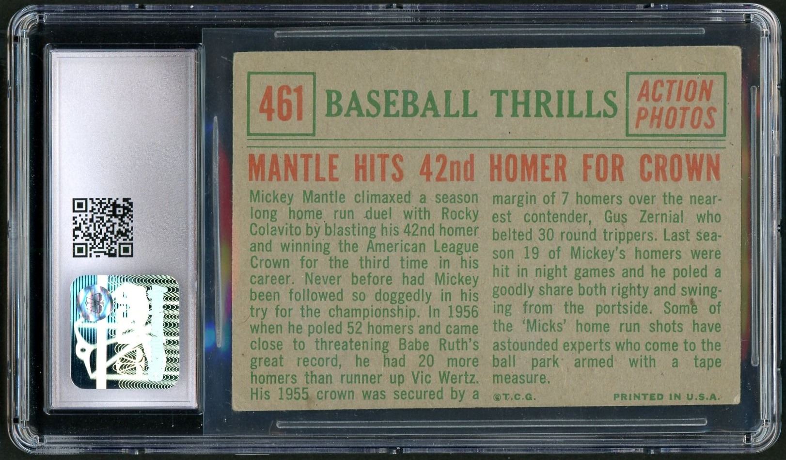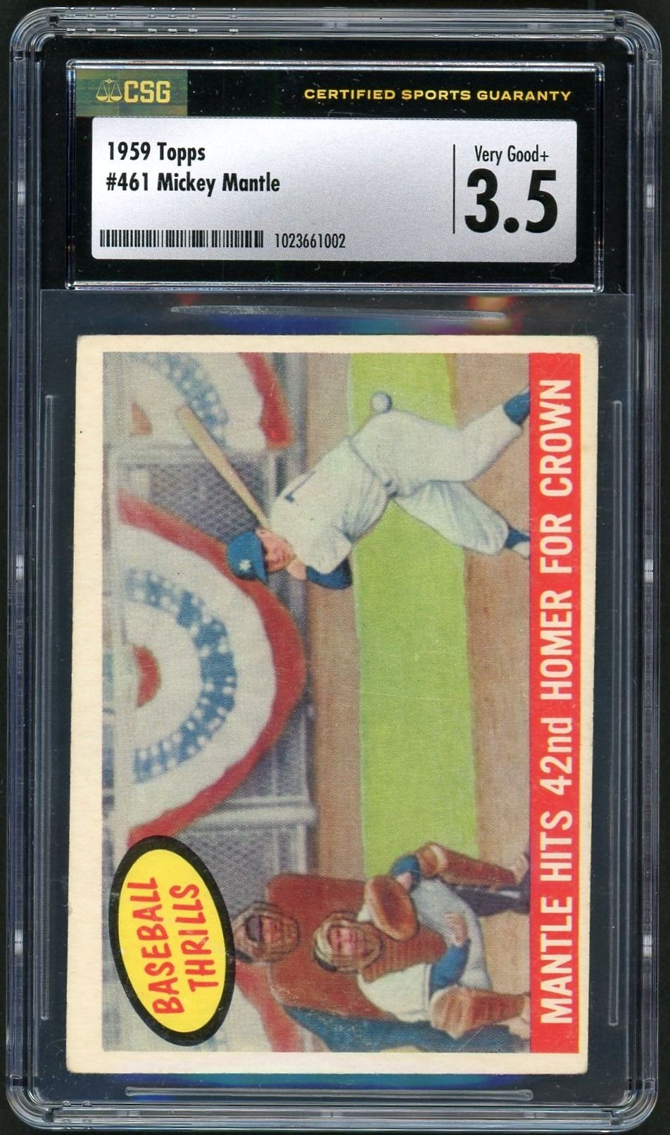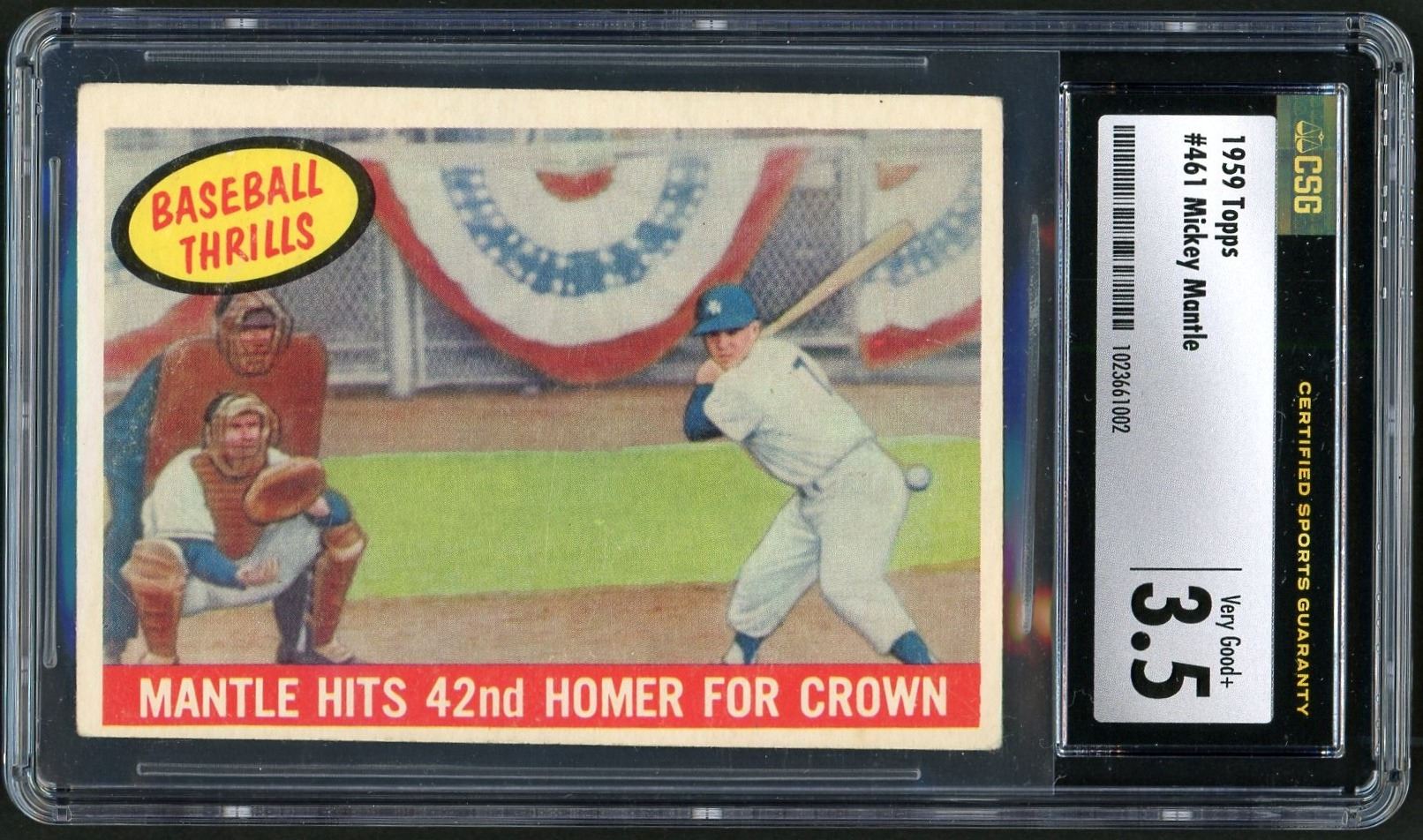 Solid eye appeal on this mid-grade card from the 1959 Topps set commemorating the Mick's 42nd HR of the 1958 season. Graded 3.5 VG+ by CSG.