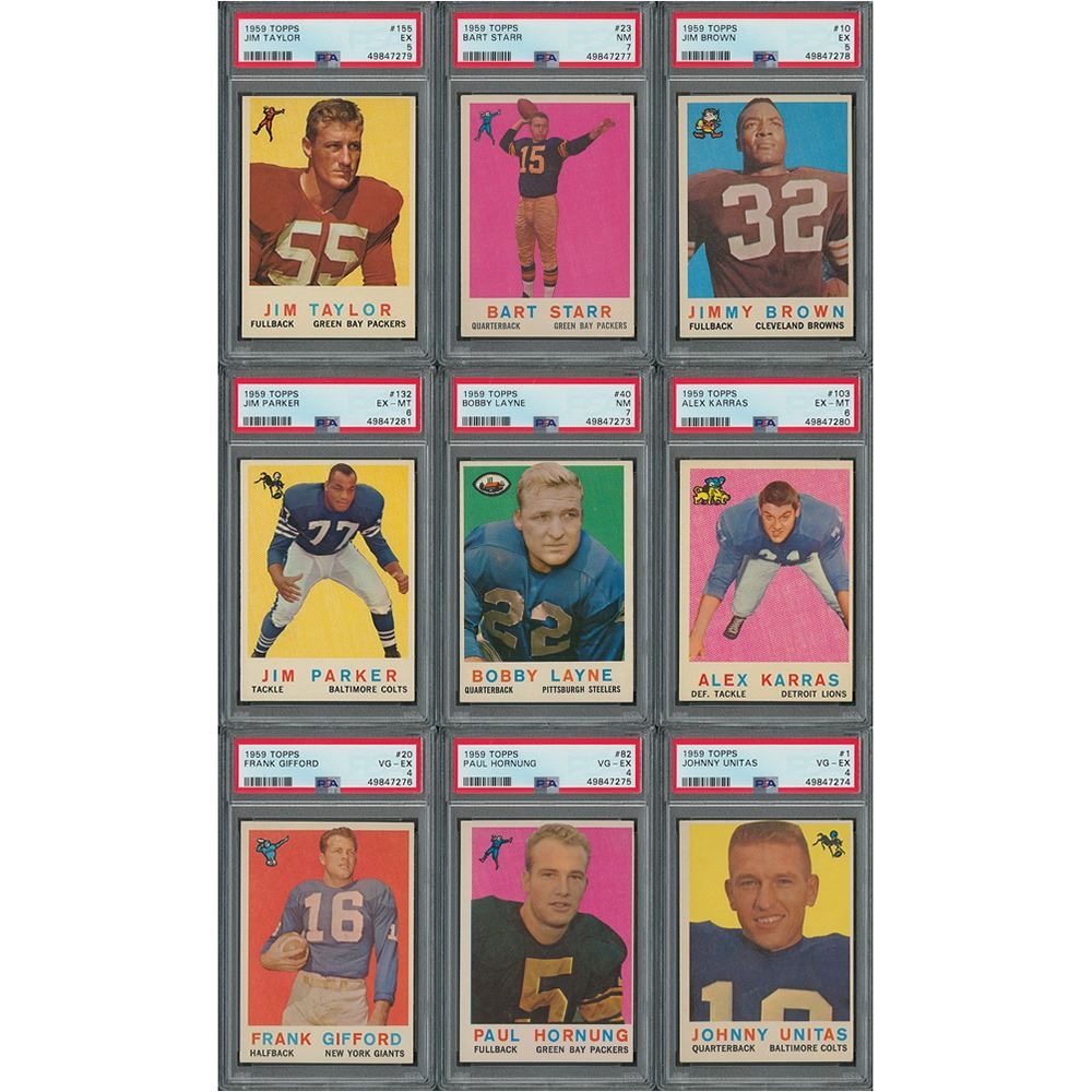 Complete set (176/176) of 1959 Topps football cards, grading overall at 25% NM, 45% EX-MT, and 30% EX (with a few lesser). Nine cards have been graded by PSA: