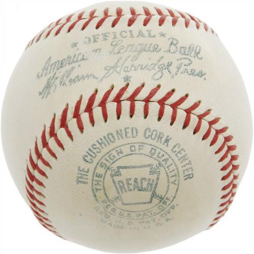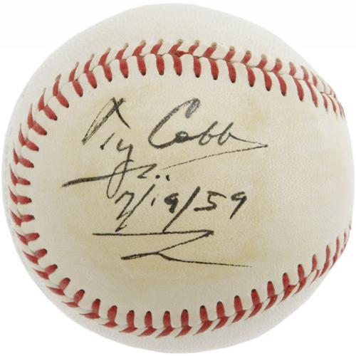 <B>1959 Ty Cobb Single Signed Baseball.</B></I> "When I began playing the game," Ty Cobb once said, "baseball was about as gentlemanly as a kick in the crotch." And over eight decades after the official end of the "Dead Ball Era," the great Georgia Peach still stands as the embodiment of that rough and tumble age of our National Pastime. Remember it always with this remarkable single, offering a 10/10 black fountain pen side panel inscription that reads, "Ty Cobb, 7/19/59." A light brushing of shellac has toned the signed panel slightly and leaves the rest of the OAL (Harridge) ball in milky-white condition. One of the finest Cobb singles on the market today. <I>LOA from PSA/DNA.</B></I> <BR><BR><B>Important notice:</B> Heritage usually auctions material at the rate of 200-250 lots per hour. On some occasions eBay Live bid software or the Internet may not be able to keep up with the pace of the auction. We recommend placing a realistic absentee bid now as insurance to avoid disappointment. Occasionally the auctioneer may eliminate or reject an eBay Live bid, and the auctioneer may also reopen a lot after the close of the eBay live bidding (usually because we missed an audience bid), and may reject your bid even if it shows you as the winning bidder. By bidding via eBay Live, you agree that Heritage may award the lot to another bidder at its sole discretion under the circumstances described above or any other reasonable circumstances. Since eBay bids are not shown to us until we open the lot on the floor, we treat those bids just like floor bids. In most cases the floor responds before the eBay bid is presented to us, due to Internet lag time, so for consistency we have made it a policy that floor bids are always considered first over tie eBay live bids. Also please note that all Heritage lots purchased through eBay Live carry a 22.5% Buyer's Premium. Please make sure you read the Terms and Conditions before you bid. This lot is being auctioned in conjunction with a live floor auction by Heritage Galleries & Auctioneers. All final auction and invoice information will be supplied by Heritage Galleries & Auctioneers, and all other information should be considered preliminary. Lot:19022 <BR><BR><B>Winning Notification and Billing:</B> After the FINAL session in this auction is complete, Heritage will send e-mail and snail mail invoices. This process normally takes several days. All final auction and invoice information will be supplied by Heritage Galleries & Auctioneers, and all other information should be considered preliminary. <BR><BR>This auction will be conducted on a live auction floor and over the Internet through eBay Live. If you choose to place an absentee bid, please take a moment to <font color='#0000ff'><u><a href='http://pages.ebay.com/liveauctions/help/before/laabsentee.html'>learn how eBay Live absentee bidding works</a></u></font><font color='#000000'>
