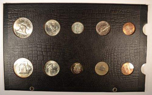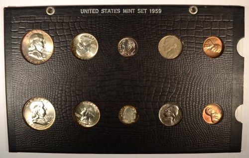 1959 U.S. MINT SET MS-65 COINS, 10 COINS IN OLD RAYMOND BOARD