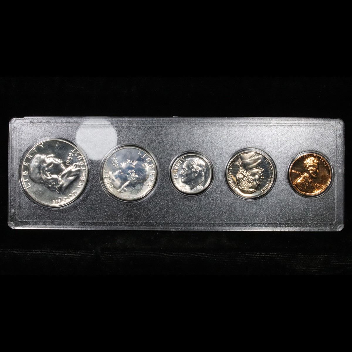 1959 United States Proof Set in Whitman Plastic Holder. This set, has a 90% Proof Silver Franklin Half Dollar, a 90% Proof Silver Quarter, a 90% Proof Silver Dime, plus the proof nickel and proof penny. All encased in a Whitman Plastic Holder.