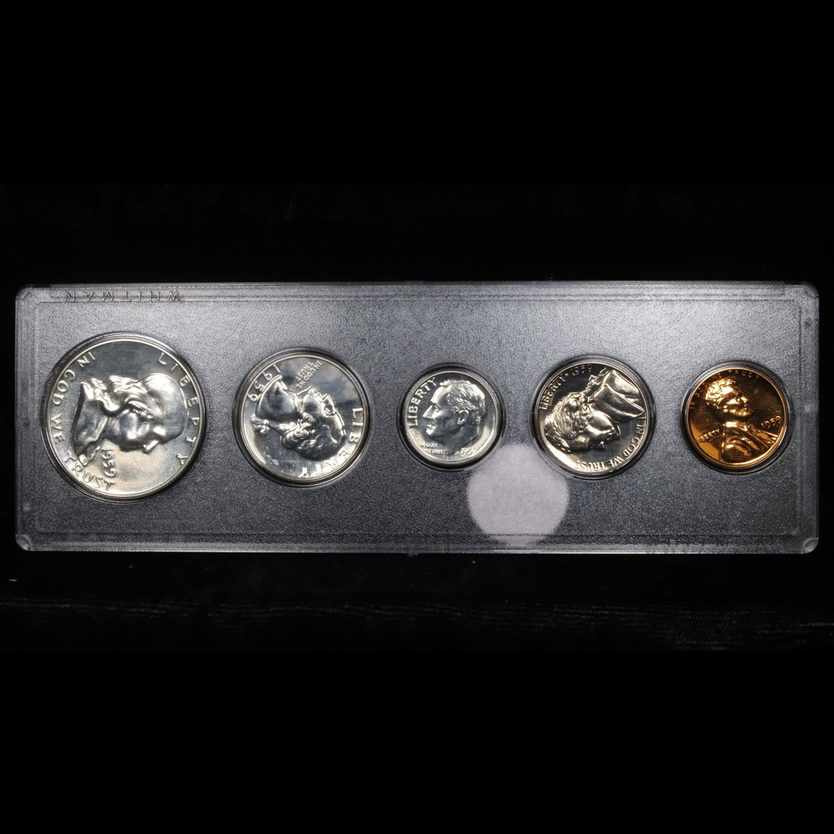 1959 United States Proof Set in Whitman Plastic Holder. This set, has a 90% Proof Silver Franklin Half Dollar, a 90% Proof Silver Quarter, a 90% Proof Silver Dime, plus the proof nickel and proof penny. All encased in a Whitman Plastic Holder.