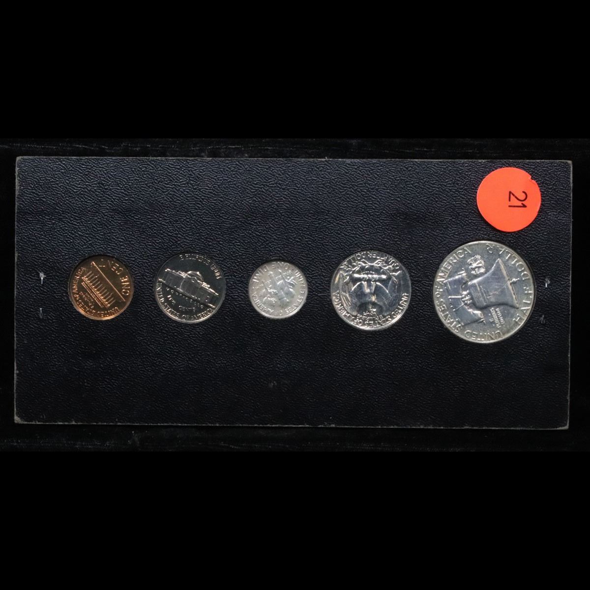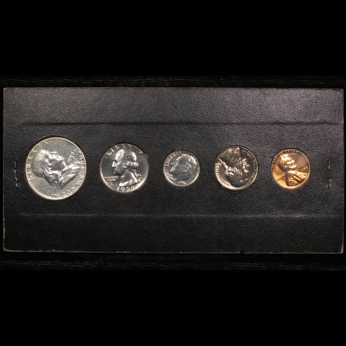 1959 United States Proof Set . A nice 1959 United States Proof Set. Includes a proof Franklin Half dollar, a proof Washington Quarter, a proof Roosevelt dime, a proof Jefferson nickel and a proof Lincoln cent. All encased in a sleeve from a proof set book.
