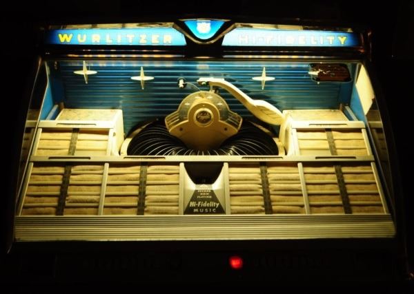 1959 45 RPM records. Works Comes with records. Measures 34" wide x 28" deep x 51" tall.