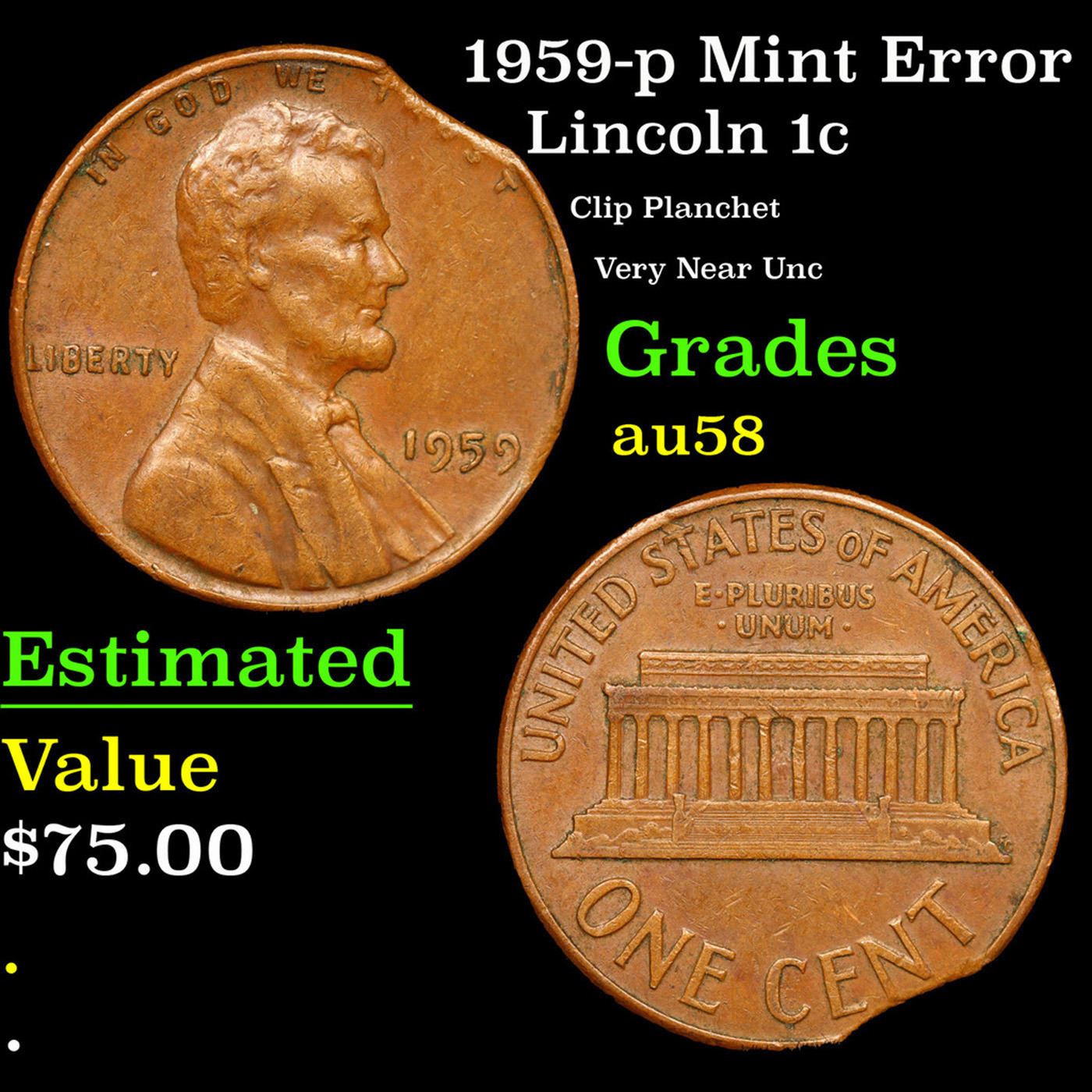 1959-p Mint Error Lincoln Cent 1c Grades Choice AU/BU Slider.