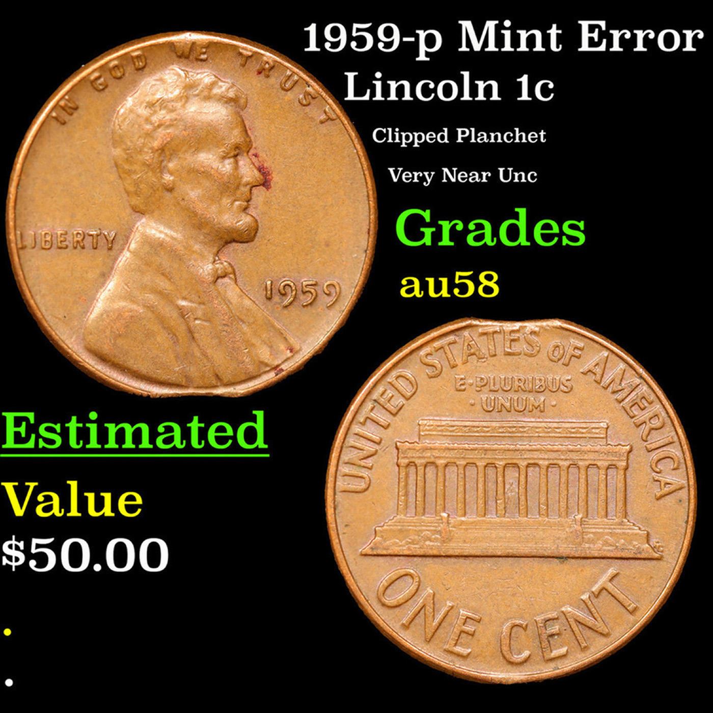 1959-p Mint Error Lincoln Cent 1c Grades Choice AU/BU Slider.