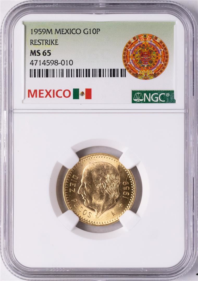 One 1959M Mexico 10 Pesos Restrike Gold Coin NGC MS65. NGC Certified.