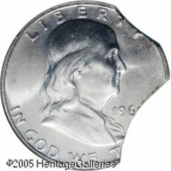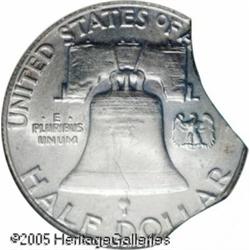 <B>196? 50C Franklin Half Dollar--5% and 15% Curved Clips--MS63 NGC.</B></I> Philadelphia Mint. A small curved clip is located at 1 o'clock and a much larger clip is located at 4:30. This is an impressive error for its type, and has fully lustrous and brilliant silver surfaces with subliminal iridescent toning. Lot:11017