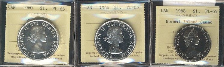 1960 $1, 1964 & 1968 NI all ICCS graded PL65 with Cameo. Lot of 3 coins.