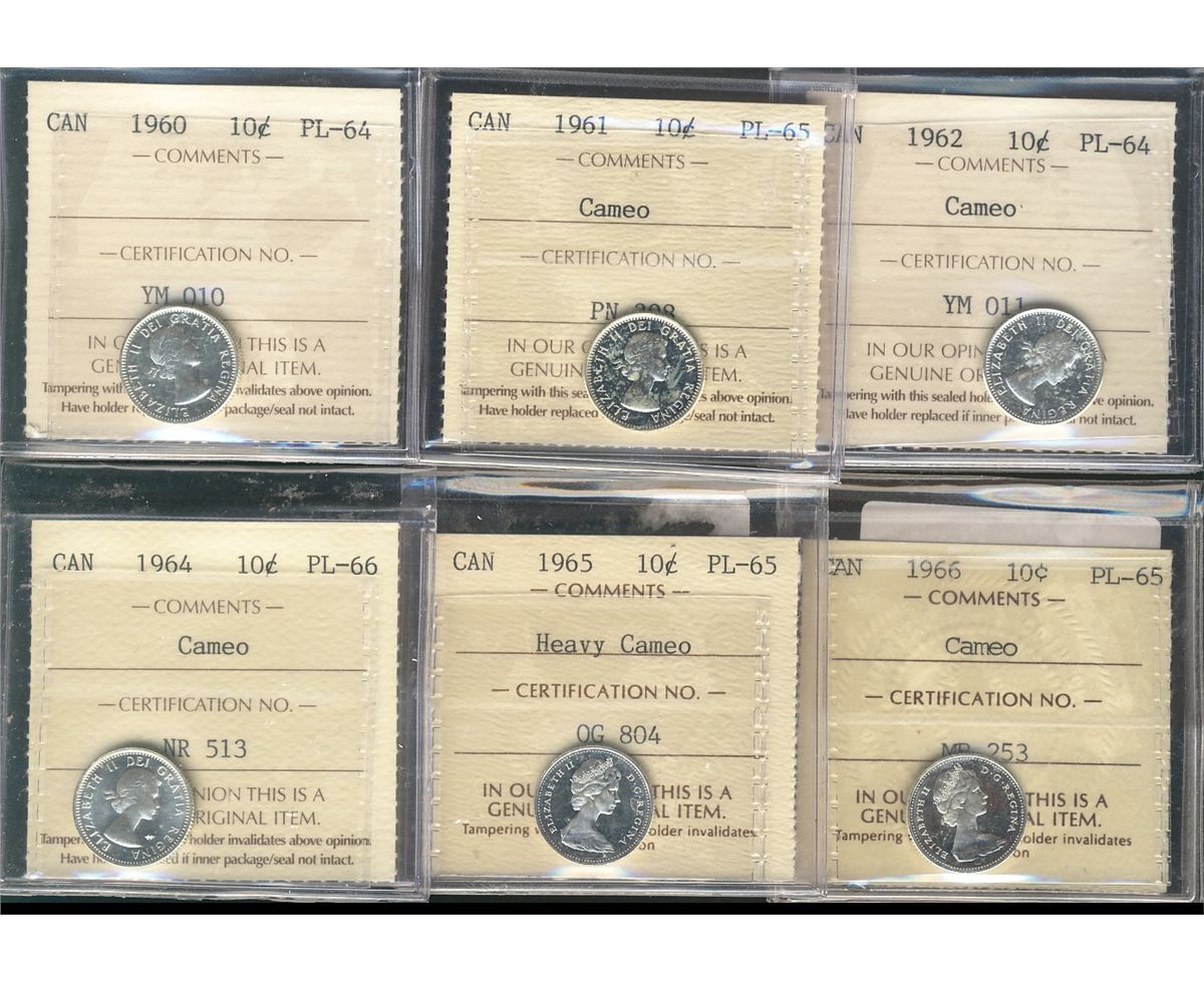 1960 10¢, 1961, 1962, 1964, 1965 & 1966 ICCS PL64 to PL65. Lot of 6 coins most with Cameo to Heavy