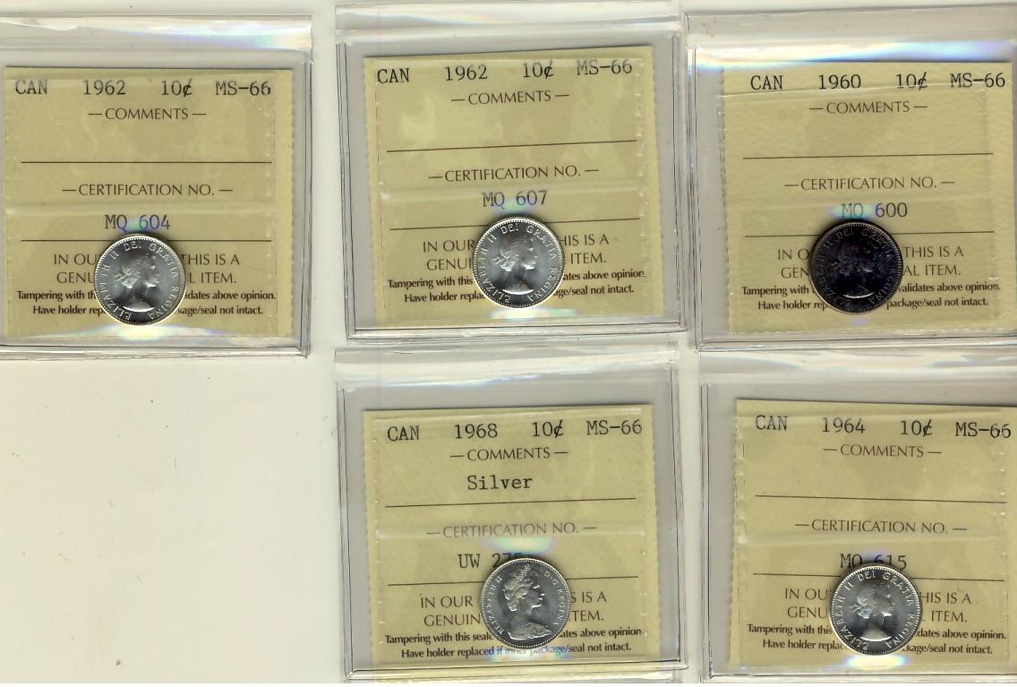 1960 10¢, 1962(2), 1964 & 1968 Silv ICCS MS66. Lot of 5 coins.