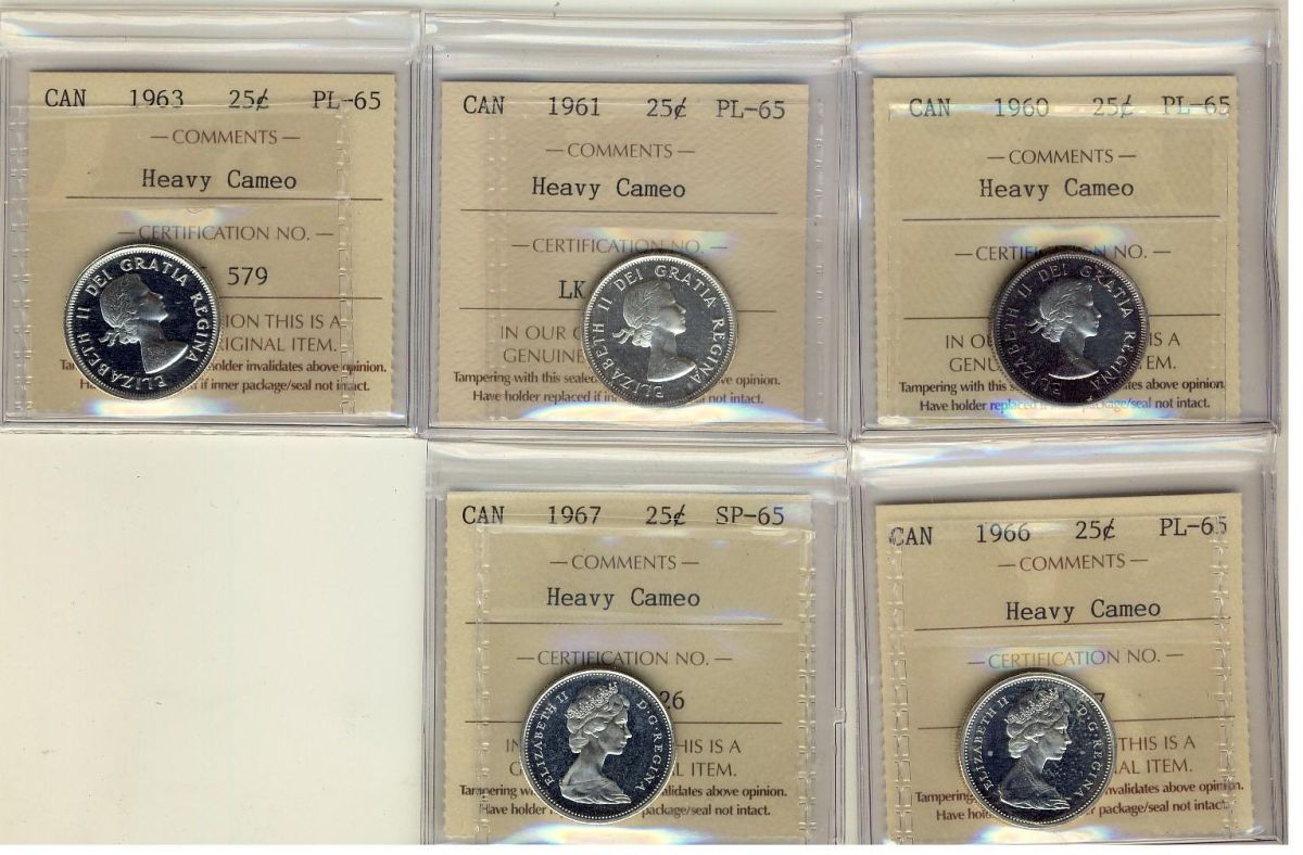 1960, 1961, 1963, 1966, 1967 25¢, all 5 coins are ICCS PL65 HEAVY CAMEO.