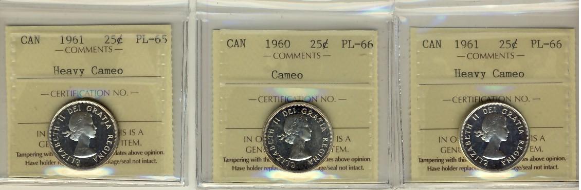 1960 & 1961 25¢ ICCS PL66 along with 1961 PL65. Lot of 3 ICCS graded coins all Cameo to Heavy Cameo designations.