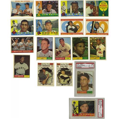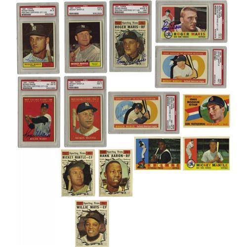 <B>1960-1961 Topps Baseball Near Complete Sets with Autographs.</B></I> Includes a 1960 Topps near complete set (566/572). Highlights are <B>PSA 7:</B></I> #563 Mantle AS; #148 Williams (VG), 160 Rival All Stars (VG/EX), 300 Aaron (VG), 316 McCovey (EX), 326 Clemente (EX), 343 Koufax (VG/EX), 350 Mantle (VG), 564 Mays AS (EX), 566 Aaron AS (EX). A total of 243 cards are signed including <B>PSA/DNA</B></I> #377 Maris, 505 Kluszewski, 565 Maris AS; #55 Mazeroski, 222 Lopez, 250 Musial, 264 Roberts, 305 Ashburn, 400 Colavito, 445 Spahn. Also included is a 1961 Topps near complete set (582/587). Highlights are <B>PSA 7:</B></I> #475 Mantle MVP, <B>PSA 5:</B></I> #300 Mantle; #290 Musial (EX), 344 Koufax (VG), 388 Clemente (EX), 415 Aaron (VG), 417 Marichal (VG), 577 Aaron AS (EX), 578 Mantle AS (EX), 579 Mays AS (EX), 580 Kaline AS (VG). A total of 270 cards are signed including <B>PSA/DNA</B></I> #2 Maris, 65 Kluszewski, 478 Maris MVP, 576 Maris AS; #20 Roberts, 132 Lopez, 173 Beantown Bombers, 200 Spahn, 245 Adcock, 330 Colavito, 476 Jensen MVP, 500 Kuenn, 574 Aparicio AS. <I>LOA from PSA/DNA.</B></I> <BR><BR><B>Important notice:</B> Heritage usually auctions material at the rate of 200-250 lots per hour. On some occasions eBay Live bid software or the Internet may not be able to keep up with the pace of the auction. We recommend placing a realistic absentee bid now as insurance to avoid disappointment. Occasionally the auctioneer may eliminate or reject an eBay Live bid, and the auctioneer may also reopen a lot after the close of the eBay live bidding (usually because we missed an audience bid), and may reject your bid even if it shows you as the winning bidder. By bidding via eBay Live, you agree that Heritage may award the lot to another bidder at its sole discretion under the circumstances described above or any other reasonable circumstances. Since eBay bids are not shown to us until we open the lot on the floor, we treat those bids just like floor bids. In most cases the floor responds before the eBay bid is presented to us, due to Internet lag time, so for consistency we have made it a policy that floor bids are always considered first over tie eBay live bids. Also please note that all Heritage lots purchased through eBay Live carry a 22.5% Buyer's Premium. Please make sure you read the Terms and Conditions before you bid. This lot is being auctioned in conjunction with a live floor auction by Heritage Galleries & Auctioneers. All final auction and invoice information will be supplied by Heritage Galleries & Auctioneers, and all other information should be considered preliminary. Lot:19587 <BR><BR><B>Winning Notification and Billing:</B> After the FINAL session in this auction is complete, Heritage will send e-mail and snail mail invoices. This process normally takes several days. All final auction and invoice information will be supplied by Heritage Galleries & Auctioneers, and all other information should be considered preliminary. <BR><BR>This auction will be conducted on a live auction floor and over the Internet through eBay Live. If you choose to place an absentee bid, please take a moment to <font color='#0000ff'><u><a href='http://pages.ebay.com/liveauctions/help/before/laabsentee.html'>learn how eBay Live absentee bidding works</a></u></font><font color='#000000'>